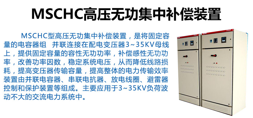 MSCHC型高壓無功集中補償裝置,是將固定容量的電容器組 并聯(lián)連接在配電變壓器3~35kV母線上,提供固定容量的容性無功功率,補償感性無功功率,改善功率因數(shù),穩(wěn)定系統(tǒng)電壓,從而降低線路損耗,提高變壓器傳輸容量,提高整體的電力傳輸效率。裝置由并聯(lián)電容器、串聯(lián)電抗器、放電線圈、避雷器、控制和保護裝置等組成。主要應(yīng)用于3~35kV負荷波動不大的交流電力系統(tǒng)中