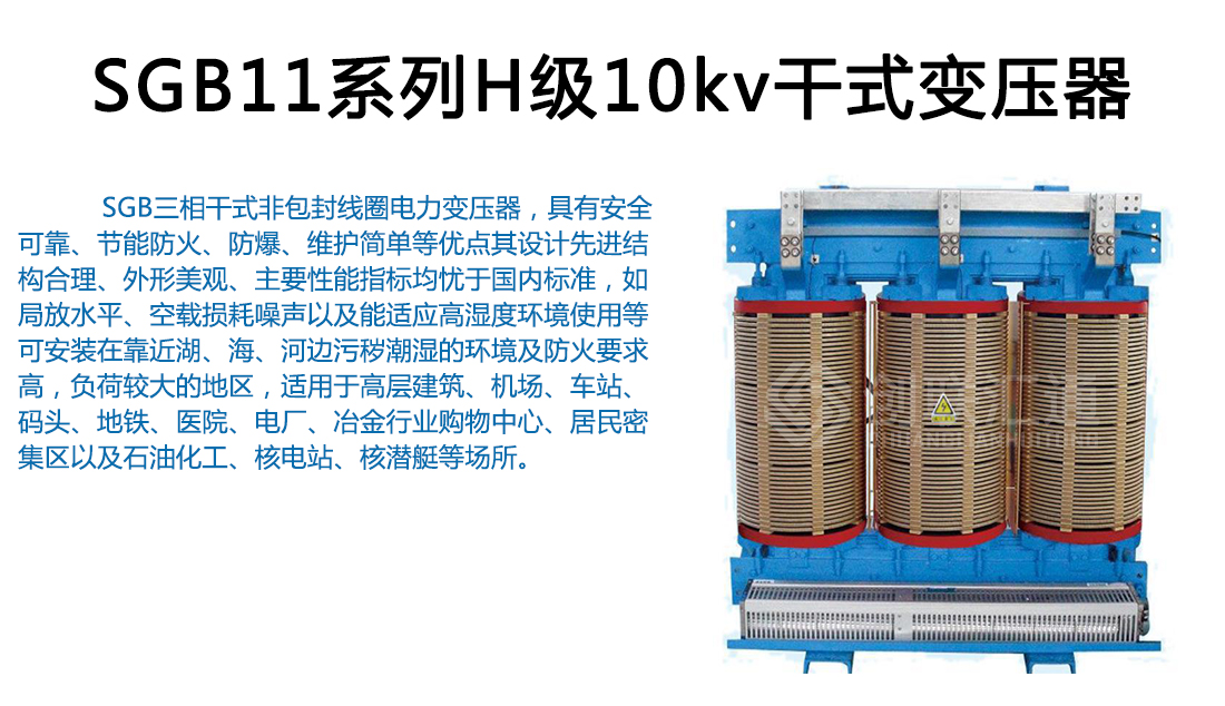 SG(B)11系列H級絕緣干式變壓器采用優(yōu)質(zhì)環(huán)保材料,先進(jìn)的生產(chǎn)檢測設(shè)備按嚴(yán)格的工藝生產(chǎn)而成,具有高性能、高安全、承受熱沖擊能力強(qiáng)等特點(diǎn),它適用于防火要求高、負(fù)荷波動大以及污穢潮濕的惡劣環(huán)境中。如:高層建筑、商業(yè)中心、住宅小區(qū)、醫(yī)院、化工廠、核電站、船舶及其它安全性要求防火、防爆、防潮的配電網(wǎng)絡(luò)與工礦企業(yè)供配電系統(tǒng)等重要或特殊環(huán)境場所。