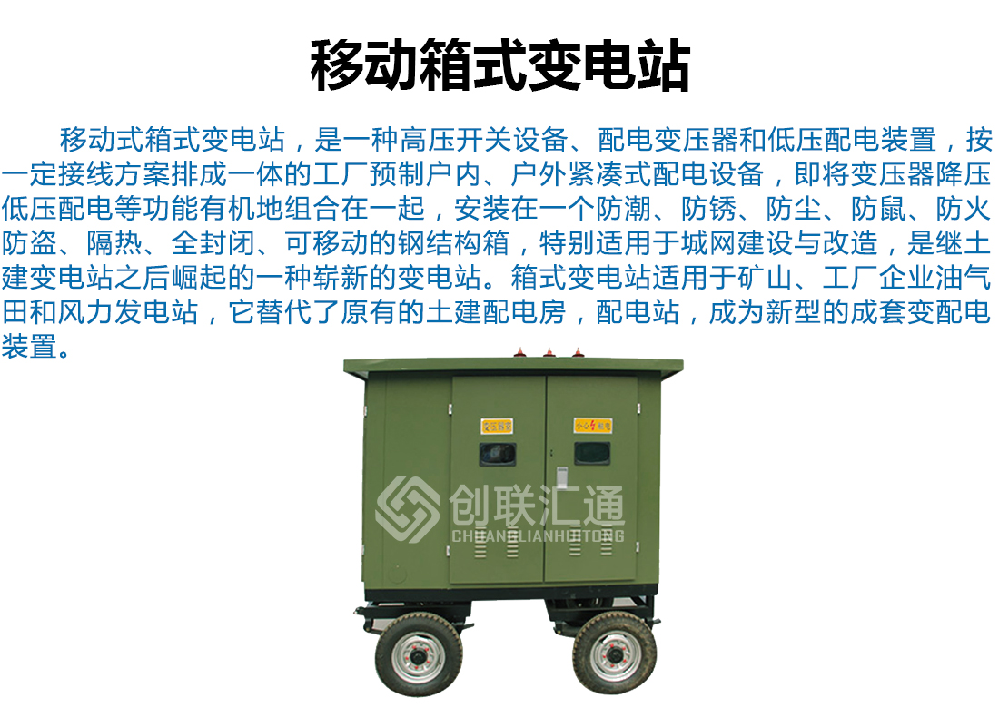 移動式箱式變電站適用于住宅小區(qū)、城市公用變、繁華鬧市、施工電源等,用戶可根據(jù)不同的使用條件、負荷等級選擇箱式變。